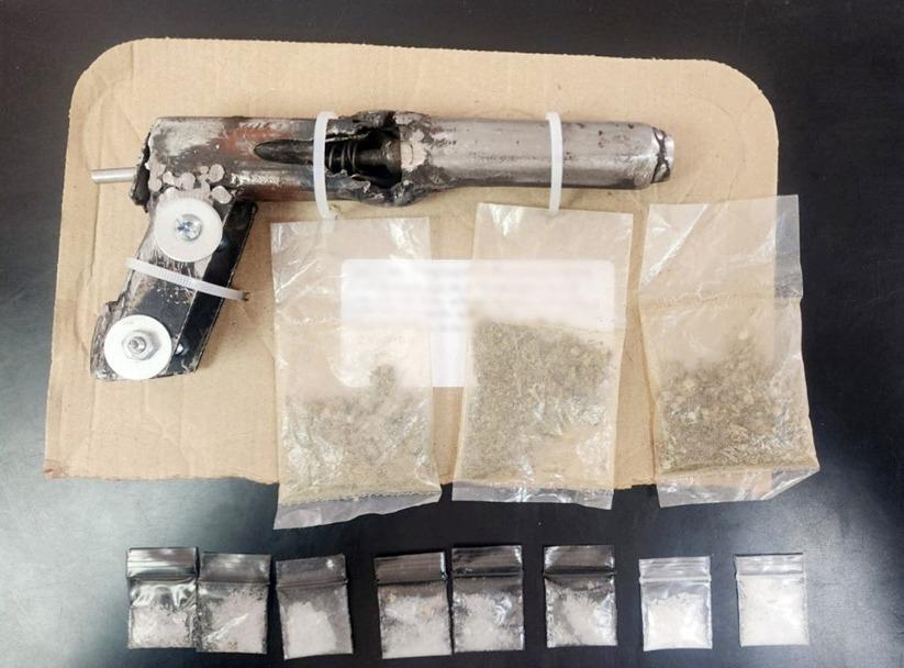 Al practicarles una revisión de rutina con base en los protocolos de actuación, se les localizó un arma de fuego artesanal hecha de tubos y un resorte como percutor, además de tres bolsas resellables con hierba verde y seca conocida como marihuana y ocho con una sustancia blanquecina similar a las metanfetaminas.