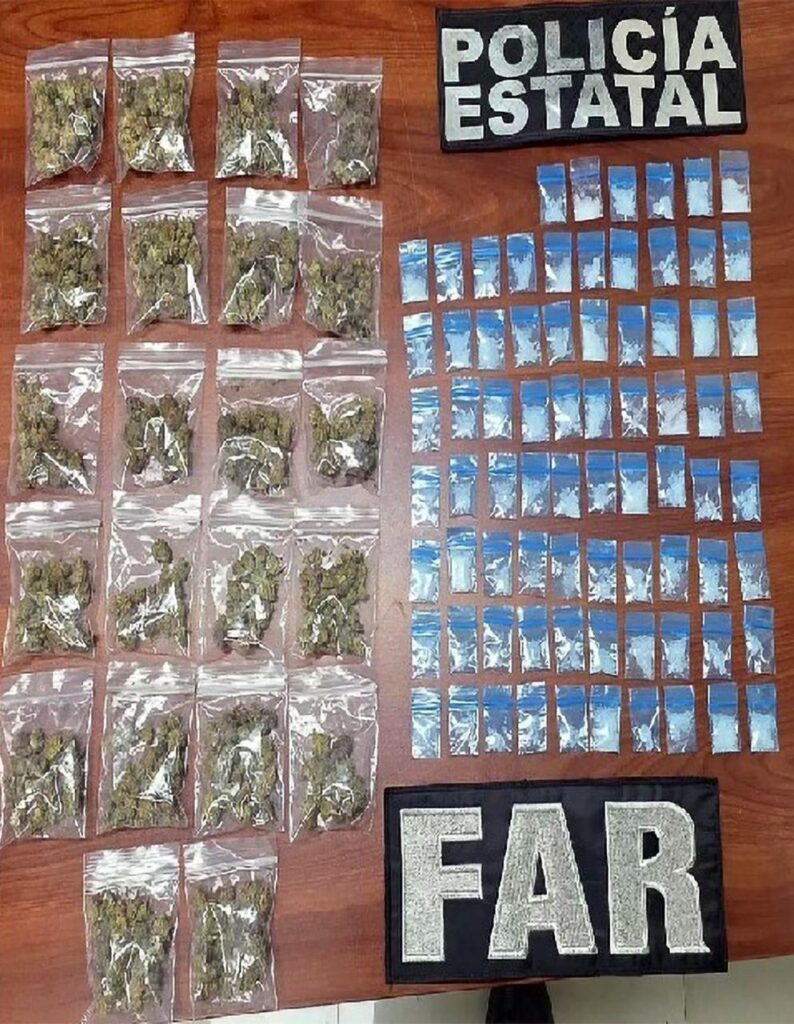 Conforme a protocolo de actuación, los uniformados le marcaron el alto para realizar una revisión preventiva, en la que localizaron entre sus pertenencias aproximadamente 22 bolsas de hierba verde y seca con características propias de la marihuana, así como 76 bolsas más pequeñas de una sustancia granulada con características similares al cristal.